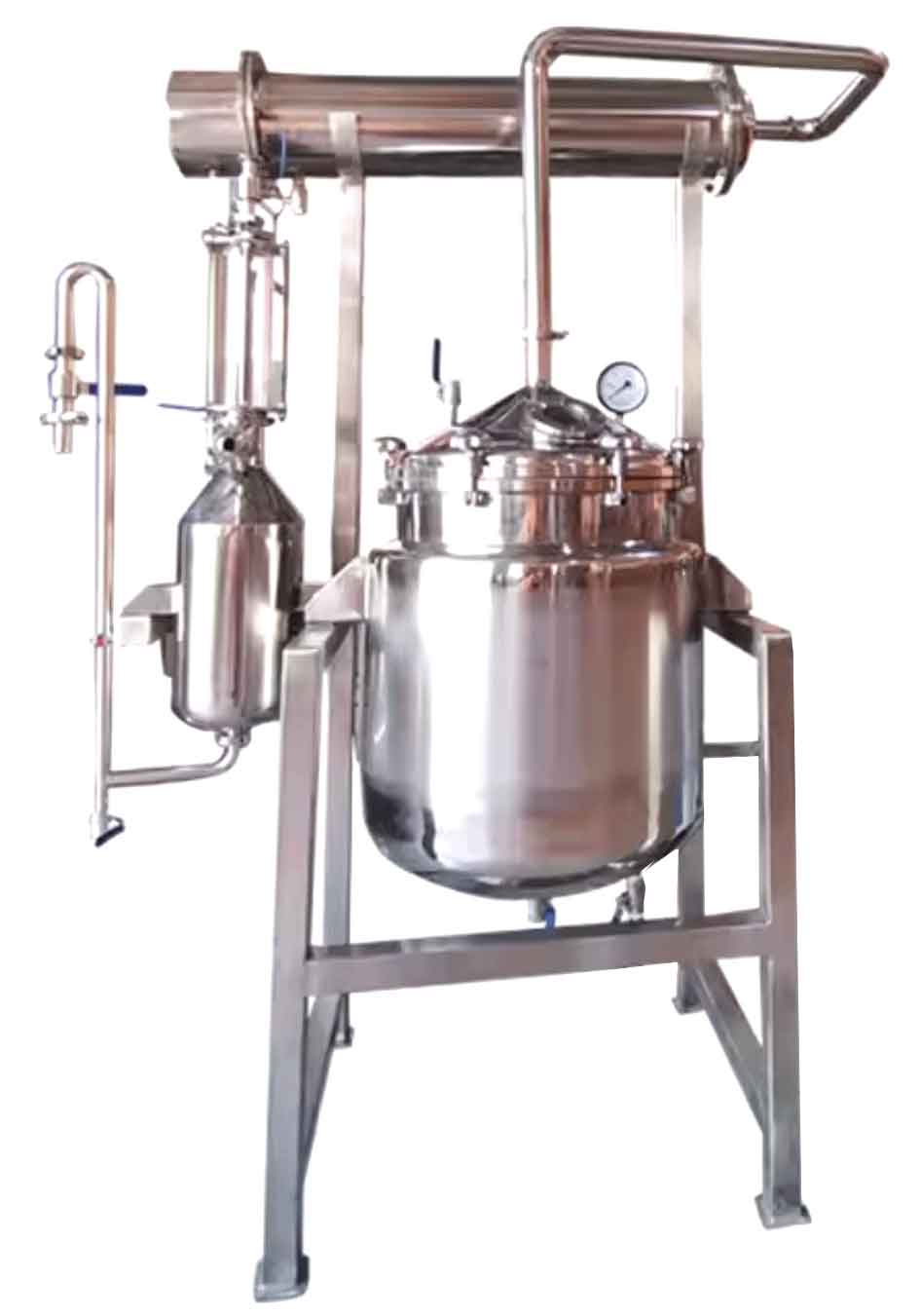 中药植物精油纯露提取机薰衣草挥发油提取设备 精油提取的蒸馏法是提取芳香植物精油最常用的方法,90%的芳香植物精油是由蒸馏法取而得。此方法是将含有芳香物质的植物部分(花朵、叶子、等)放入一个大的不锈钢蒸